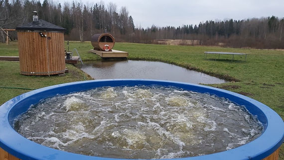 In front of the sauna, there's a terrace and a pond with a ladder for going into the water. In winter, we have an ice hole. We heat the sauna for 12 hours, then air it out for 1 hour and prepare it for our guests. Altogether, it takes 13 hours, resulting in 100 degrees Celsius.